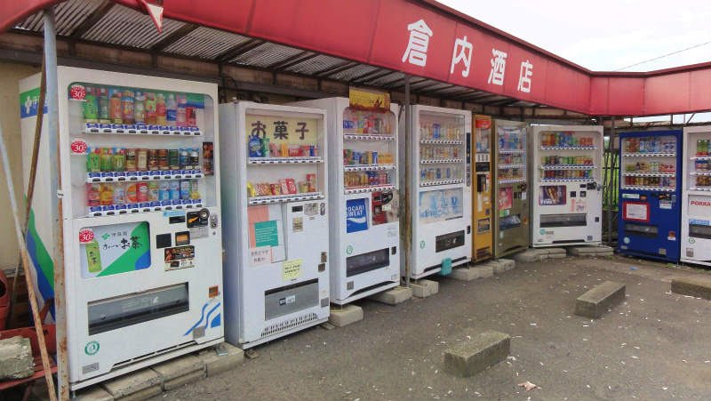 酒屋店舗の前にたばこ、ドリンク、酒、お菓子など17台もの自販機が並ぶ。