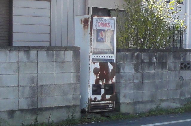 住宅の壁に設置された自販畿。 サンプルも無くどこのメーカーかも不明。筐体はかろうじて富士電機製である事が分かる。 ルーレット付き、セレクトボタンの形、等から80年代後半から90年代頃と推測できる。 どんなものが売られていたのか興味な所だ。